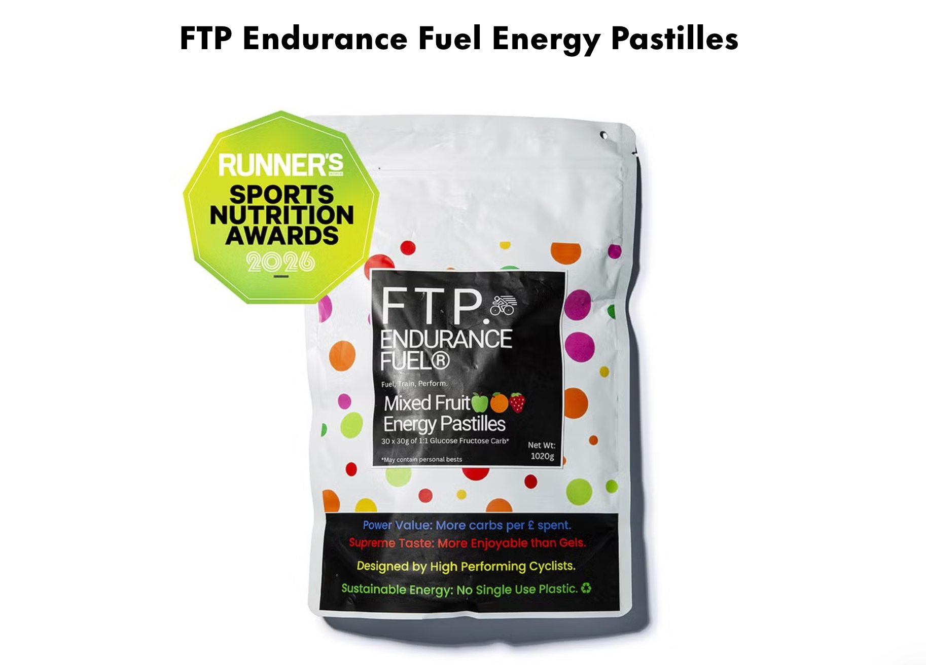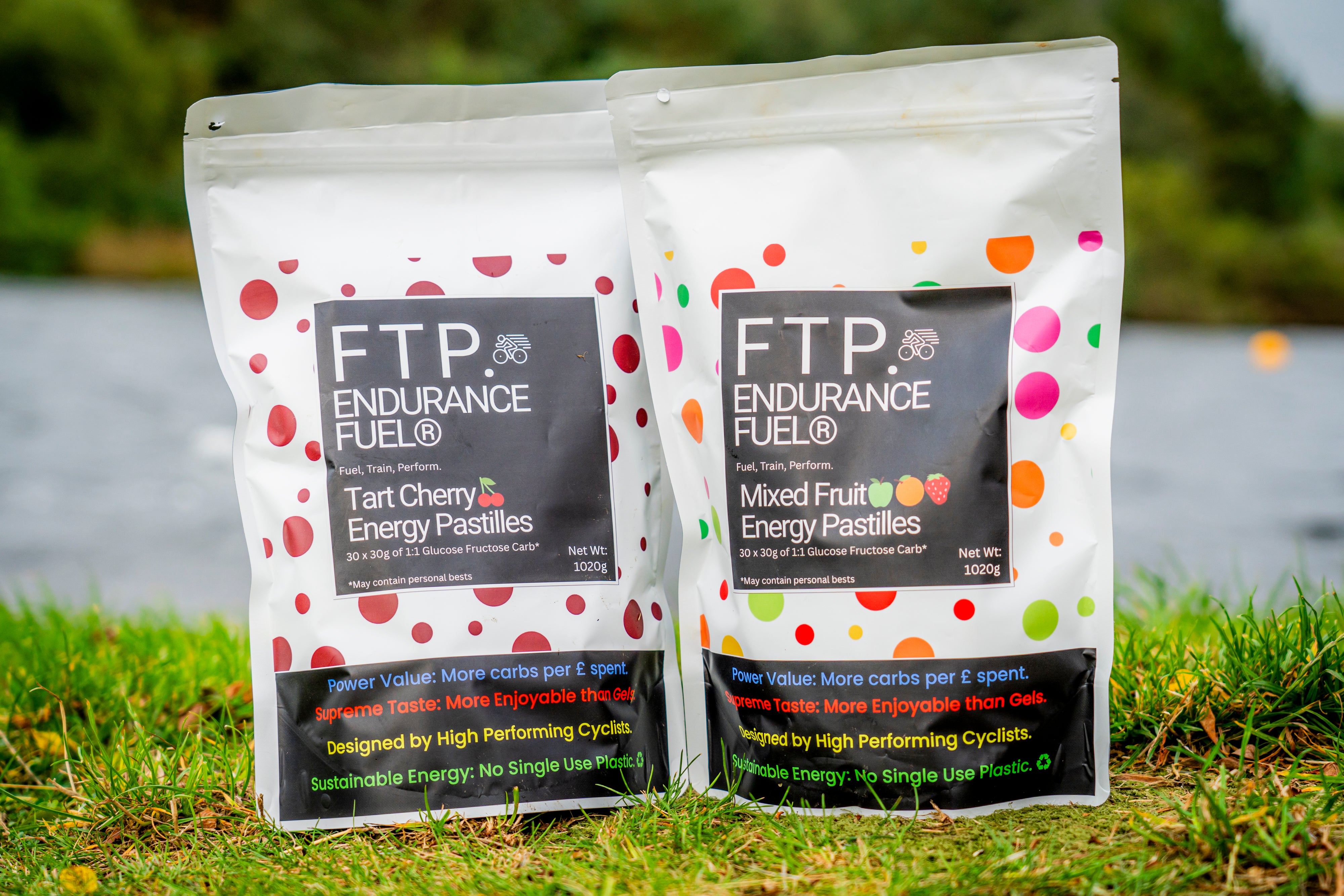 FTP Endurance Fuel Energy Pastilles are energy supplements designed specifically for cyclists, runners, and endurance athletes. Available in 1.02kg bulk packs, eachpack contains 30 servings of 34g (2 pastilles per serving), delivering a robust 30g of carbohydrates per serving. This equates to the energy content of approximately 30 standard energy gels, offering a cost-effective, high-performance alternative, keeping you fuelled for longer. The pastilles are formulated with a 1:1 blend of glucose and fructose, enhanced with tart cherry flavouring designed to provide sustained energy and support recovery during intense workouts or races by replenishing glycogen stores. The mission behind these pastilles is to empower athletes to achieve their personal bests while enjoying a sustainable, enjoyable fuelling experience, free from the clutter of single-use packaging